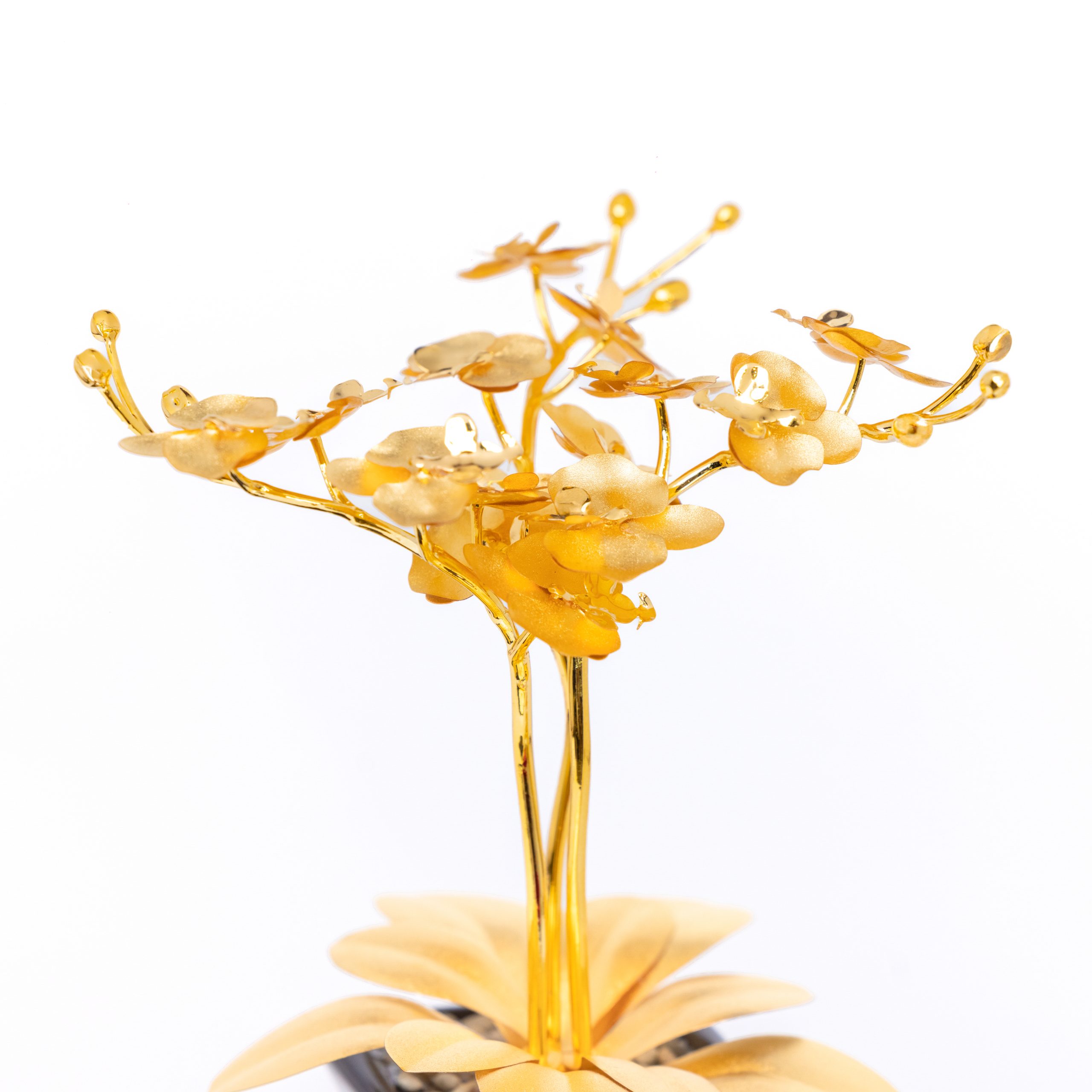Sản phẩm được chế tác thủ công tinh xảo, từng cánh hoa mềm mại, uyển chuyển và sống động. Lớp vàng 24K phủ bên ngoài không chỉ tăng giá trị thẩm mỹ mà còn giúp sản phẩm bền đẹp theo thời gian. Phần đế được thiết kế chắc chắn, sang trọng, tạo nên tổng thể hài hòa và đẳng cấp. Đây là lựa chọn hoàn hảo cho những ai yêu thích sự tinh tế và muốn thể hiện gu thẩm mỹ cao cấp.