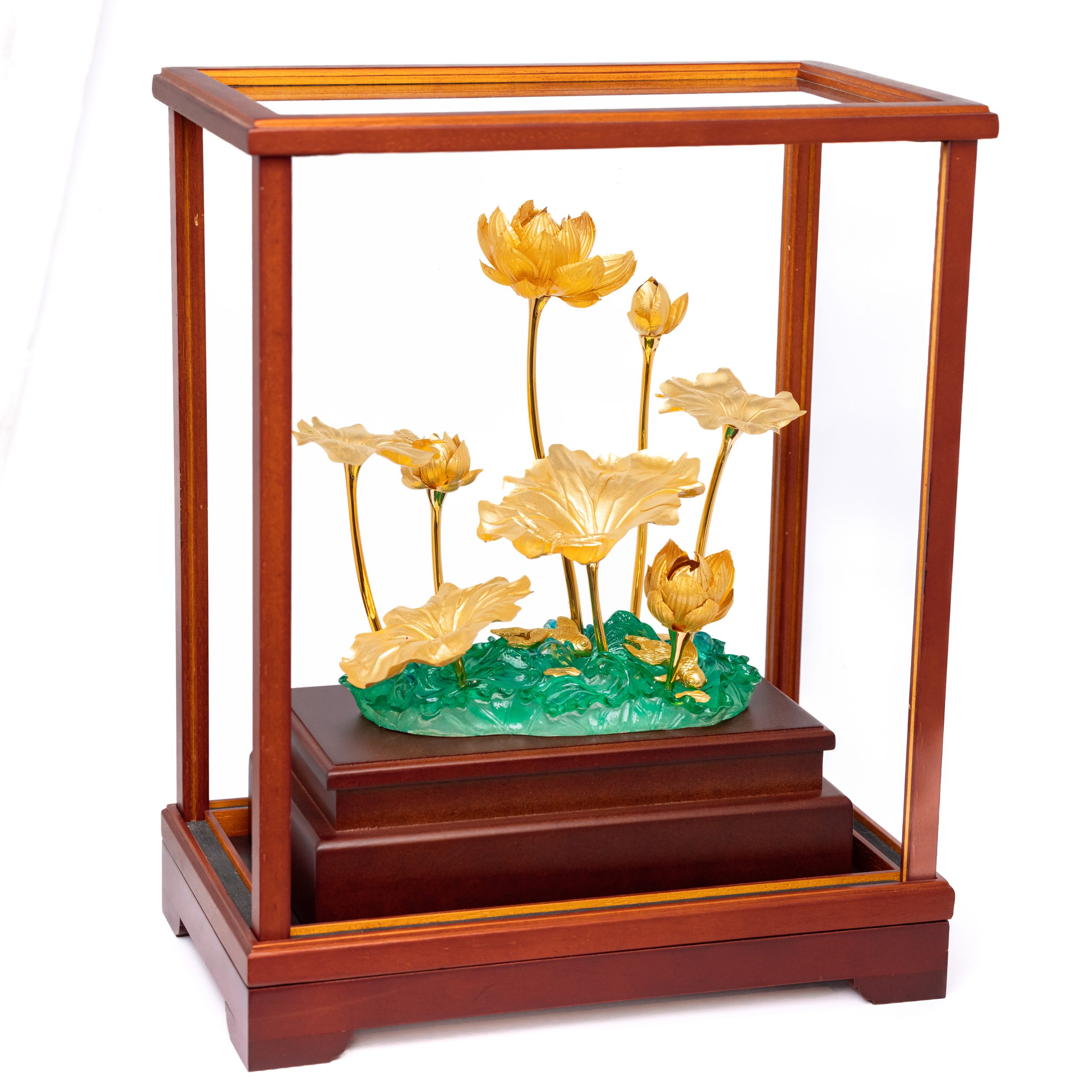 Lớp vàng 24K phủ bên ngoài giúp sản phẩm luôn giữ được độ sáng bóng, sang trọng theo thời gian. Khung kính và đế gỗ cao cấp không chỉ bảo vệ sản phẩm mà còn tôn lên vẻ đẹp đẳng cấp, phù hợp với những không gian yêu cầu tính thẩm mỹ cao.