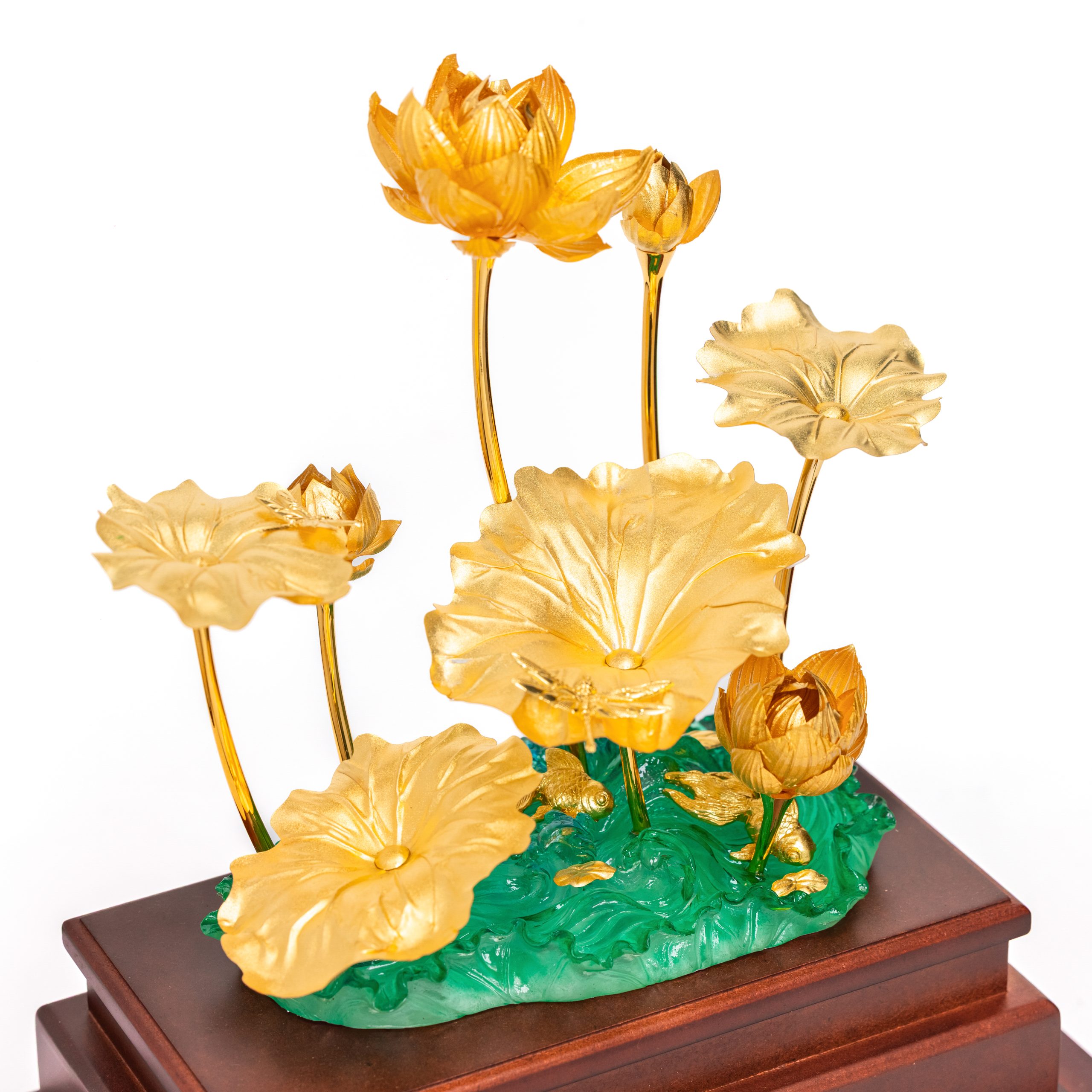 Sản phẩm gây ấn tượng bởi bố cục nghệ thuật hài hòa, tái hiện khung cảnh hồ sen sống động với nhiều bông hoa ở các trạng thái khác nhau. Điều này tượng trưng cho sự sinh sôi, phát triển liên tục và thịnh vượng bền vững. Phần lá sen được tạo hình mềm mại, kết hợp cùng chi tiết cá vàng bên dưới mang ý nghĩa phong thủy về tài lộc dồi dào và cuộc sống sung túc.
