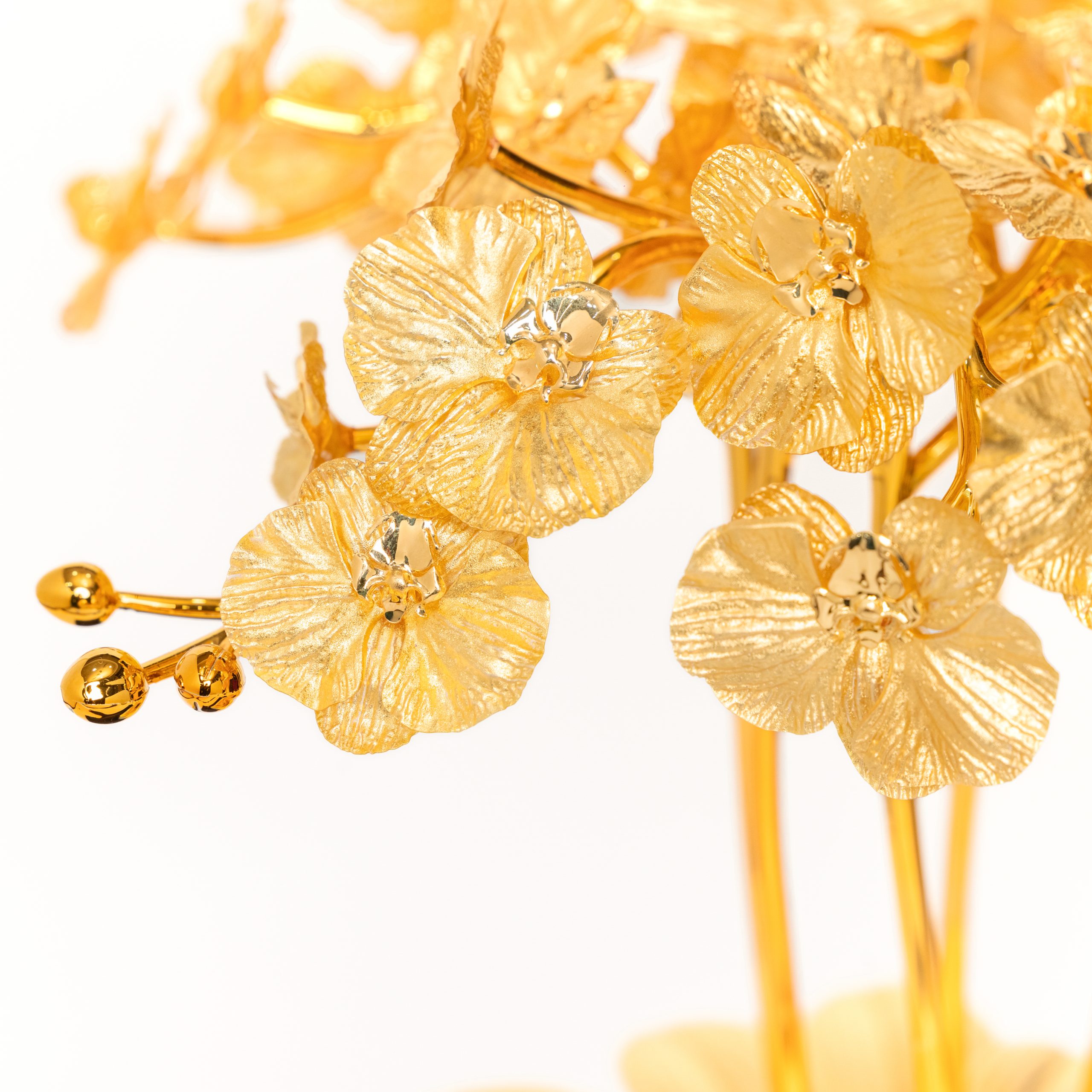 Lan Hồ Điệp Dát Vàng 24K là tác phẩm nghệ thuật mang vẻ đẹp tinh tế và sang trọng, lấy cảm hứng từ loài hoa lan được mệnh danh là “nữ hoàng của các loài hoa”. Những cánh lan mềm mại, thanh thoát được tái hiện sống động qua từng chi tiết, kết hợp với lớp dát vàng 24K sáng bóng tạo nên tổng thể vừa thanh cao vừa đẳng cấp. Sản phẩm không chỉ là vật phẩm trang trí mà còn là biểu tượng của gu thẩm mỹ tinh tế và sự trân trọng giá trị nghệ thuật.