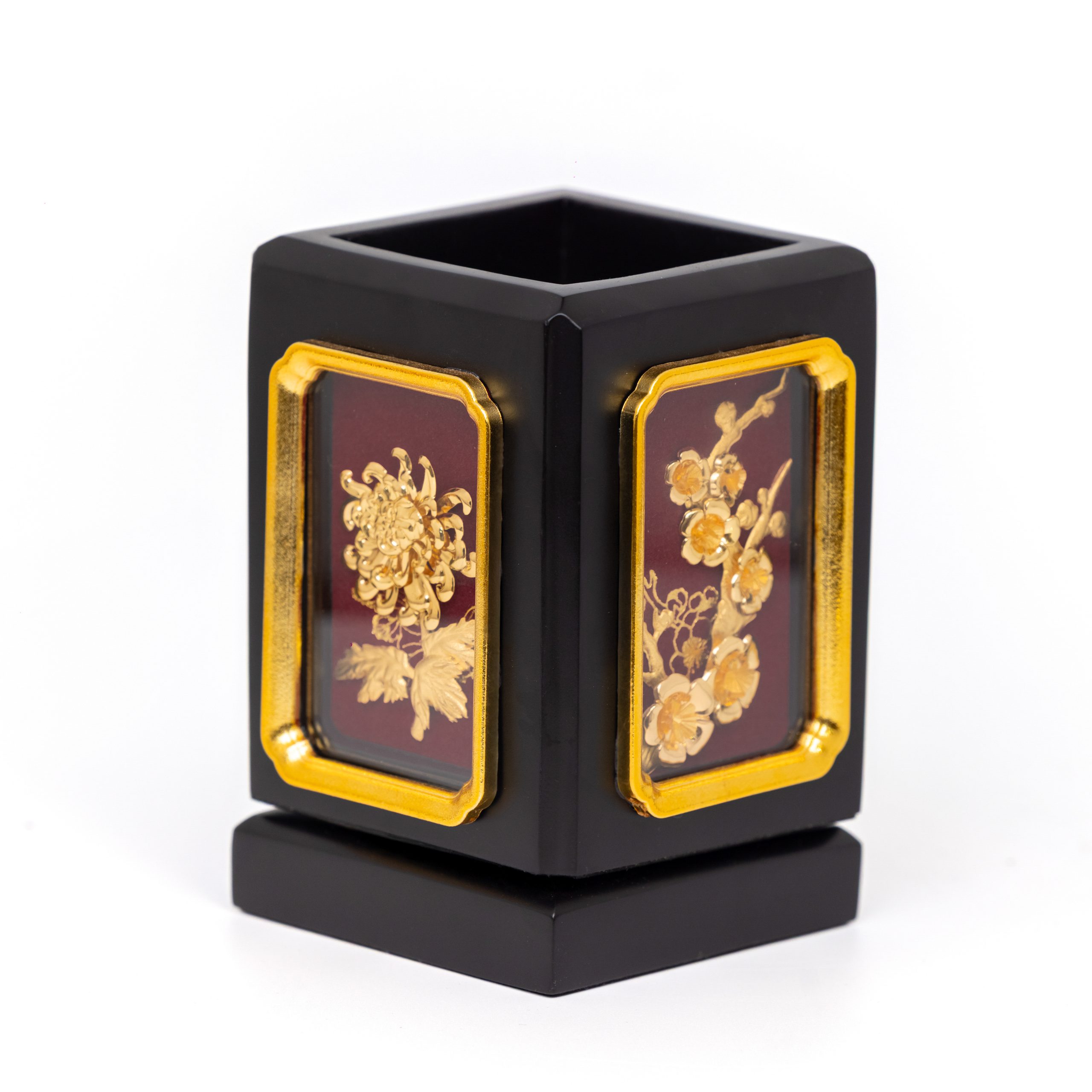 Với thiết kế vuông vức chắc chắn, các mặt được trang trí bằng họa tiết tứ quý như lan, trúc, cúc… dát vàng nổi bật trên nền đỏ trầm, sản phẩm mang lại cảm giác hài hòa giữa cổ điển và hiện đại. Đây không chỉ là vật dụng văn phòng mà còn là món đồ trang trí cao cấp, tạo điểm nhấn ấn tượng trên bàn làm việc.