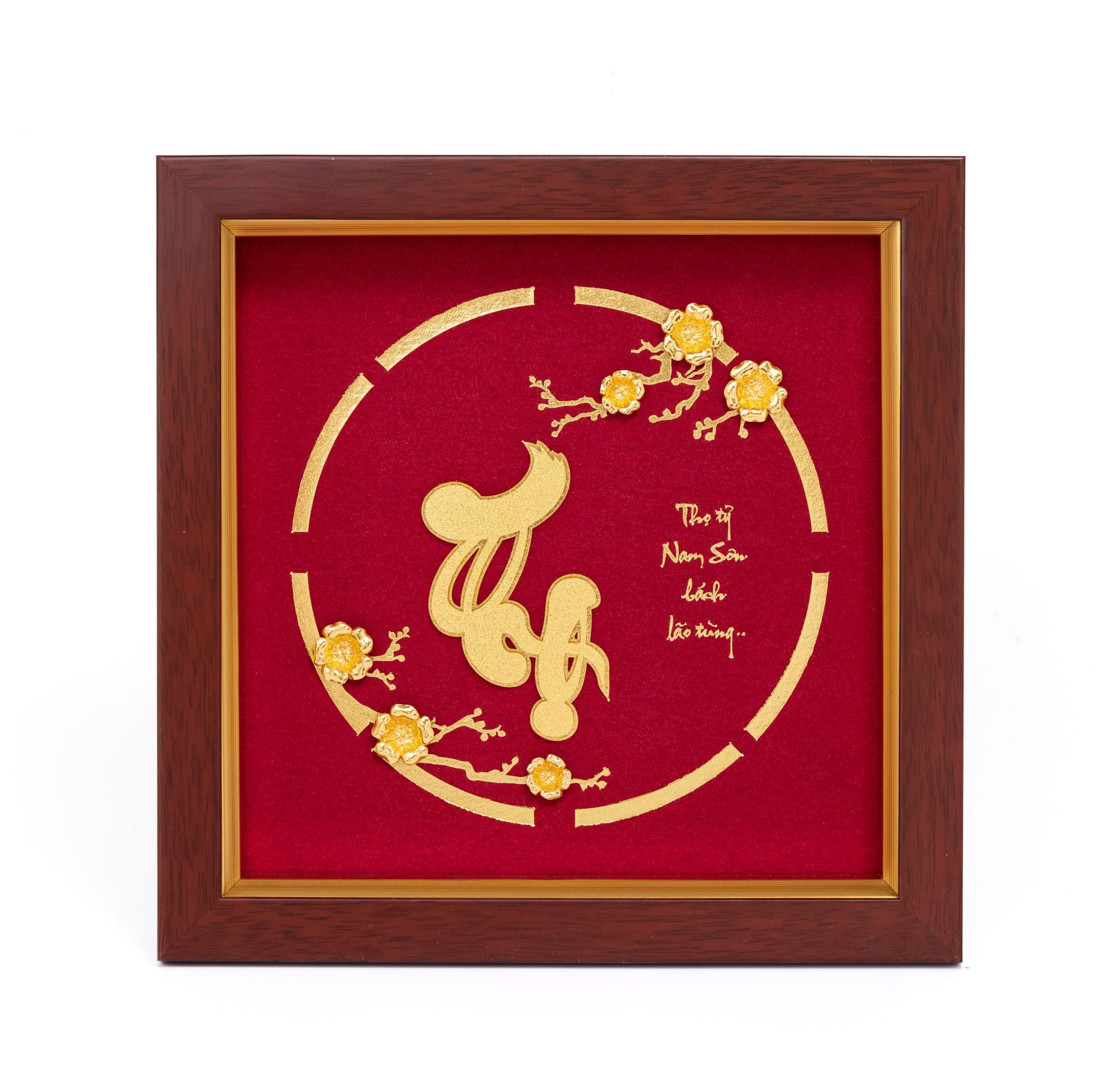 Điểm đặc biệt của sản phẩm nằm ở lớp vàng 24K được dát thủ công tinh xảo trên từng chi tiết, mang lại hiệu ứng ánh kim sang trọng và độ bền vượt trội theo thời gian. Xung quanh tranh chữ Thọ thư pháp dát vàng 24K là họa tiết hoa mai nở rộ – biểu tượng của sự trường tồn, tài lộc và khởi đầu tốt đẹp. Sự kết hợp hài hòa này không chỉ làm tăng giá trị thẩm mỹ mà còn mang ý nghĩa phong thủy mạnh mẽ, giúp gia chủ thu hút vượng khí, sống an yên và viên mãn.
